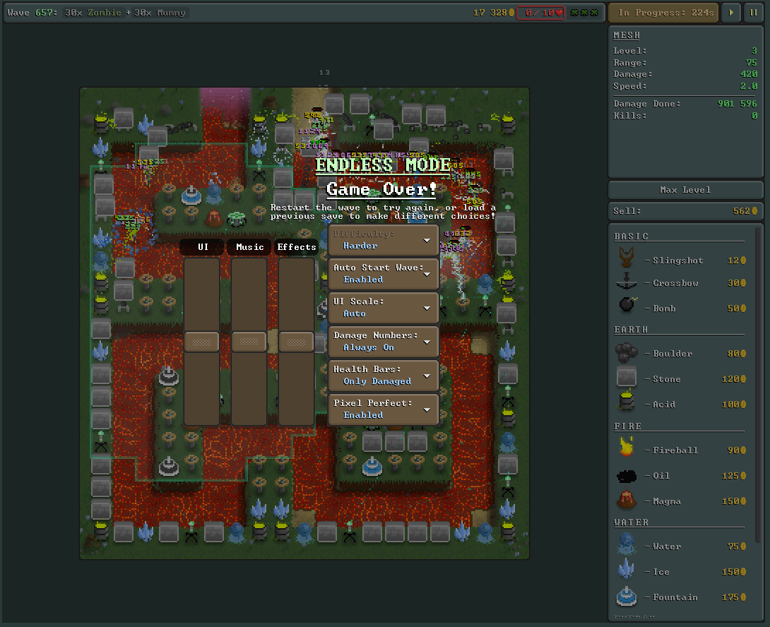 I am loving this game! Great little tower defense, cool towers, satisfying enemy waves. I've beaten it on Harder a couple times, now. Endless mode on Harder difficulty is *HARD*. I can't get past the Slime King no matter what combination of towers I try to use! Any tips?